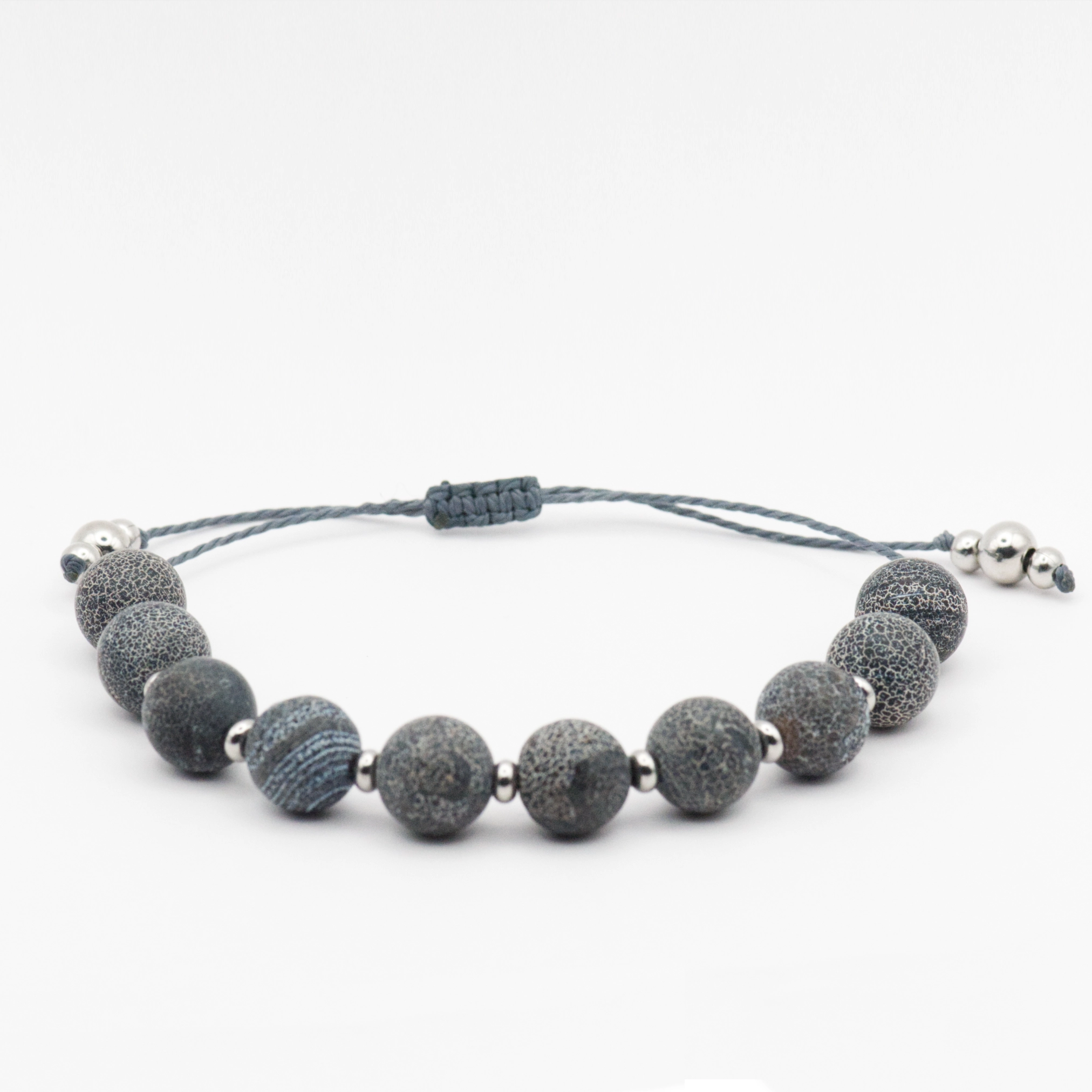 Naturalny kamień agat kwasowany w szarym odcieniu nadaje bransoletce surowości i elegancji jednocześnie. Dzięki swojemu szlachetnemu wyglądowi agat doskonale komponuje się z różnymi stylami, dodając subtelnej finezji każdej stylizacji.