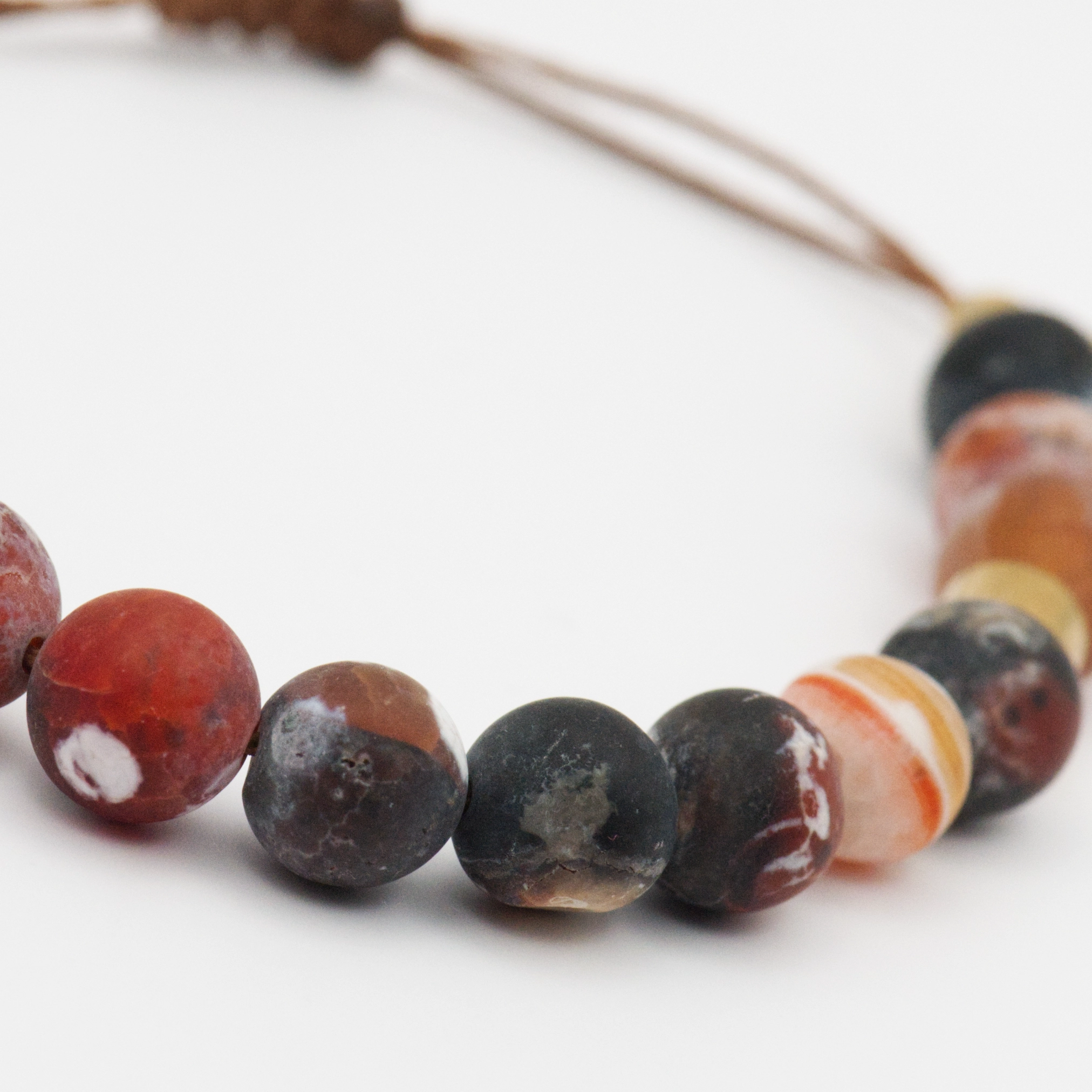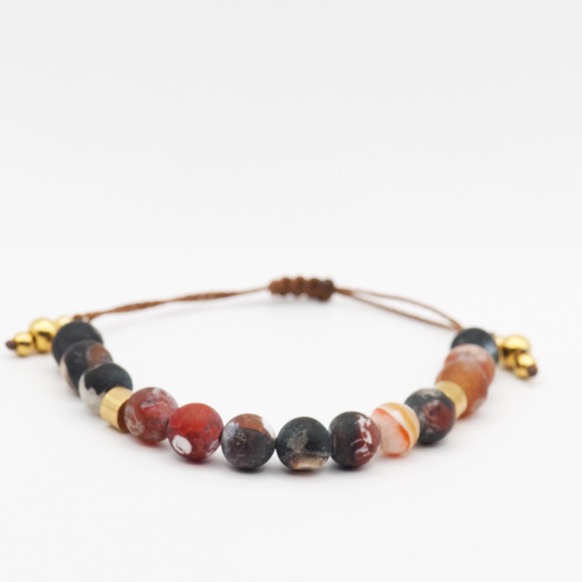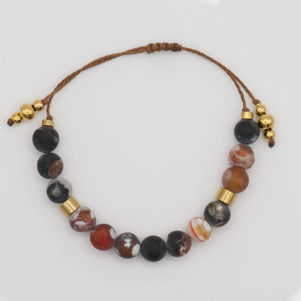 Agat matowy to odmiana agatu, która została poddana procesowi szlifowania lub matowienia, co nadaje mu charakterystyczny, jedwabisty wygląd. W odcieniach brązu agat matowy może mieć subtelne przejścia od jasnych beżów do głębokich, ciepłych brązów, co dodaje bransoletce naturalności i ciepła.