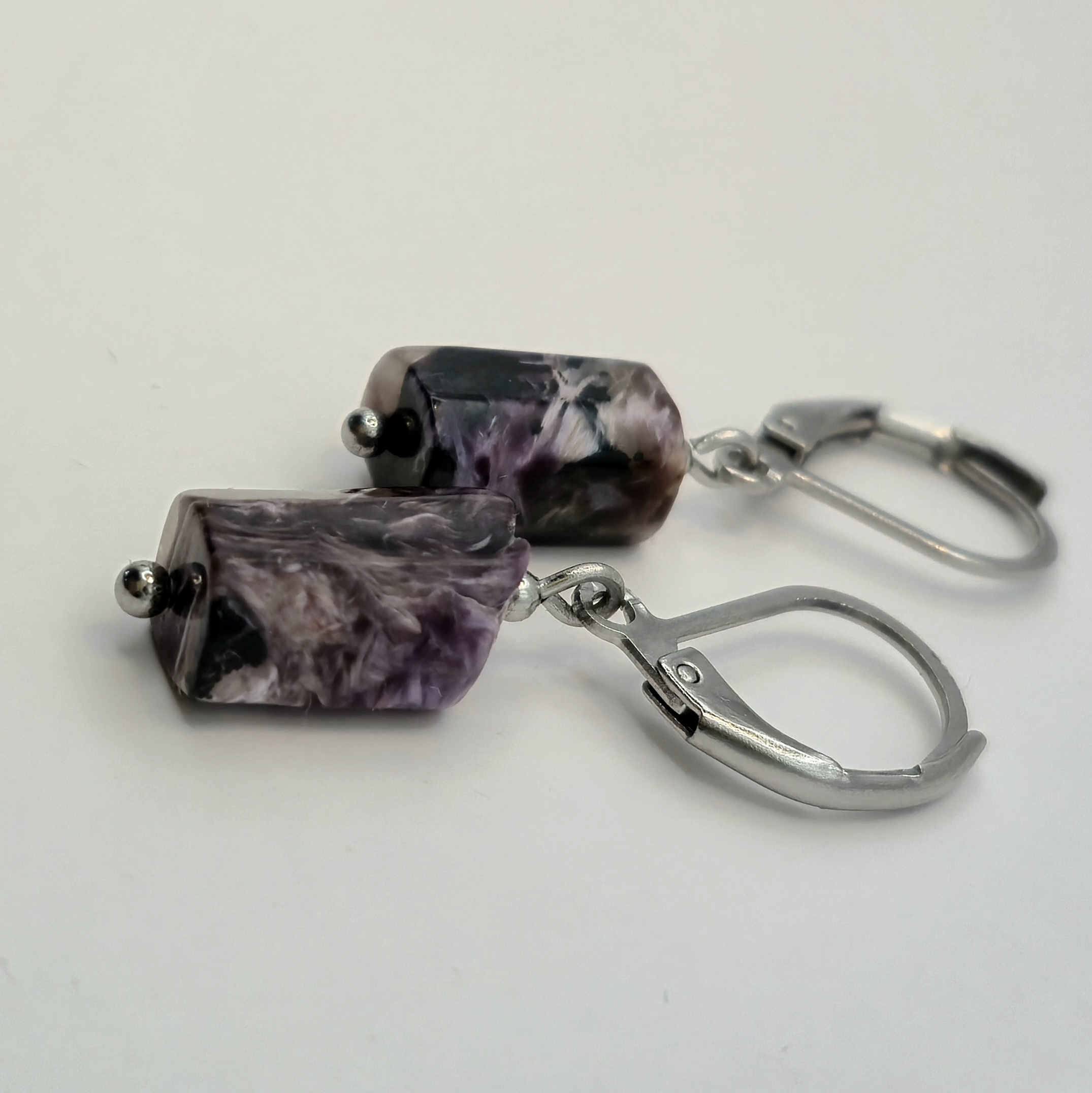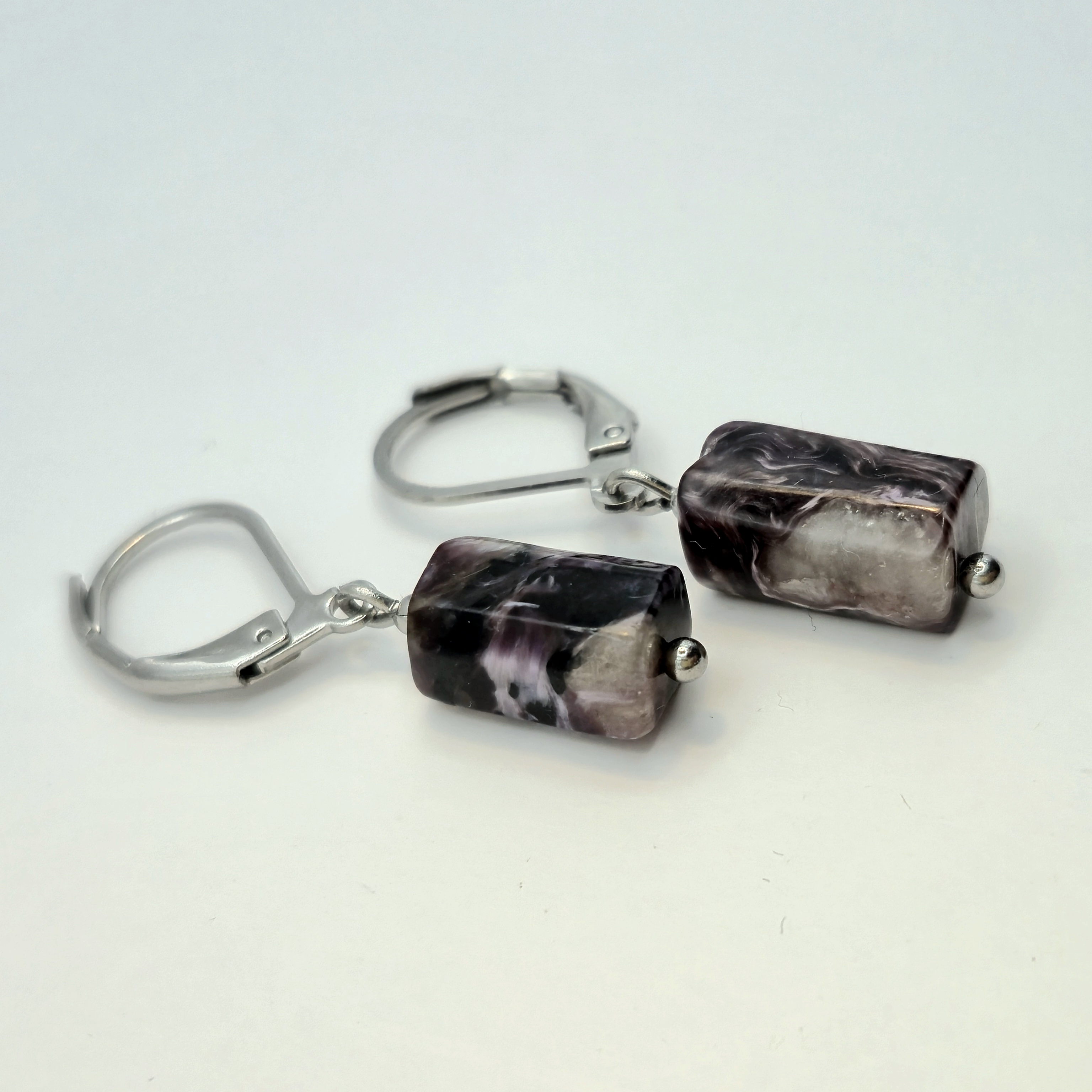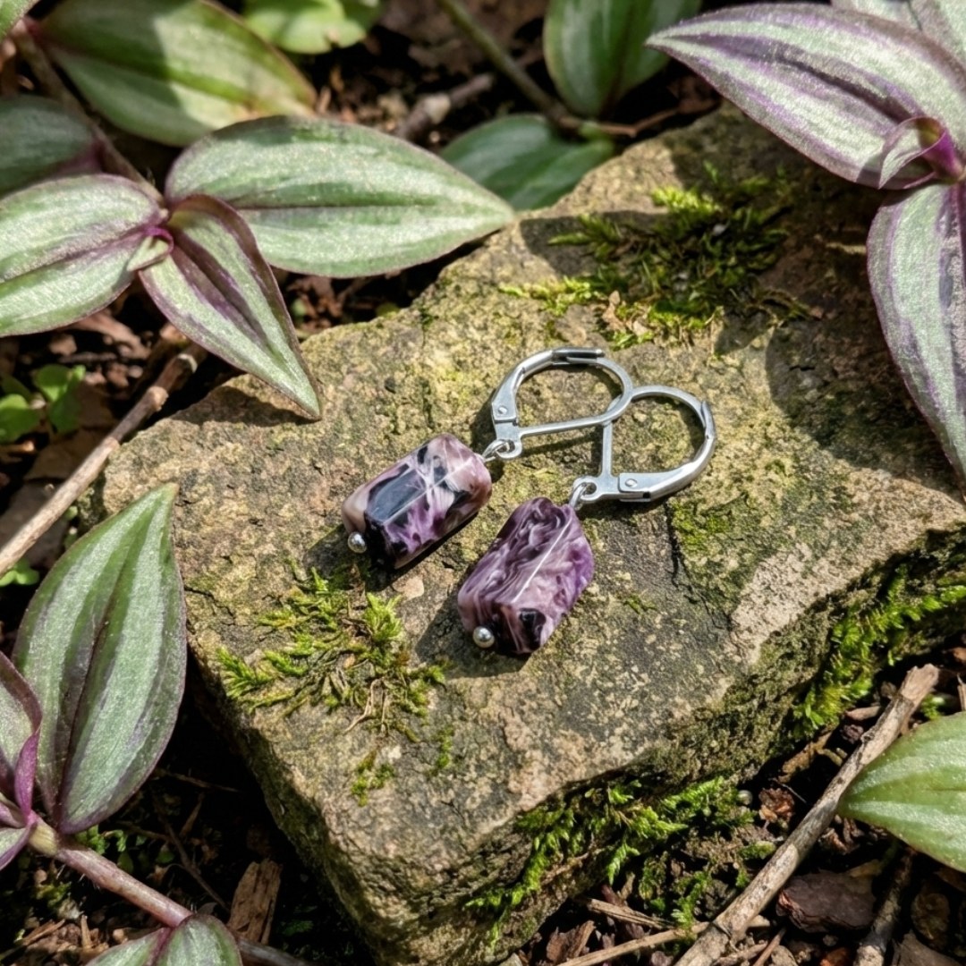 Czaroit to kamień transformacji i odwagi – wspiera w podejmowaniu ważnych decyzji, oczyszcza umysł i pomaga uwolnić się od lęku. Jego niepowtarzalne wzory sprawiają, że każdy egzemplarz kolczyków jest unikatowy.