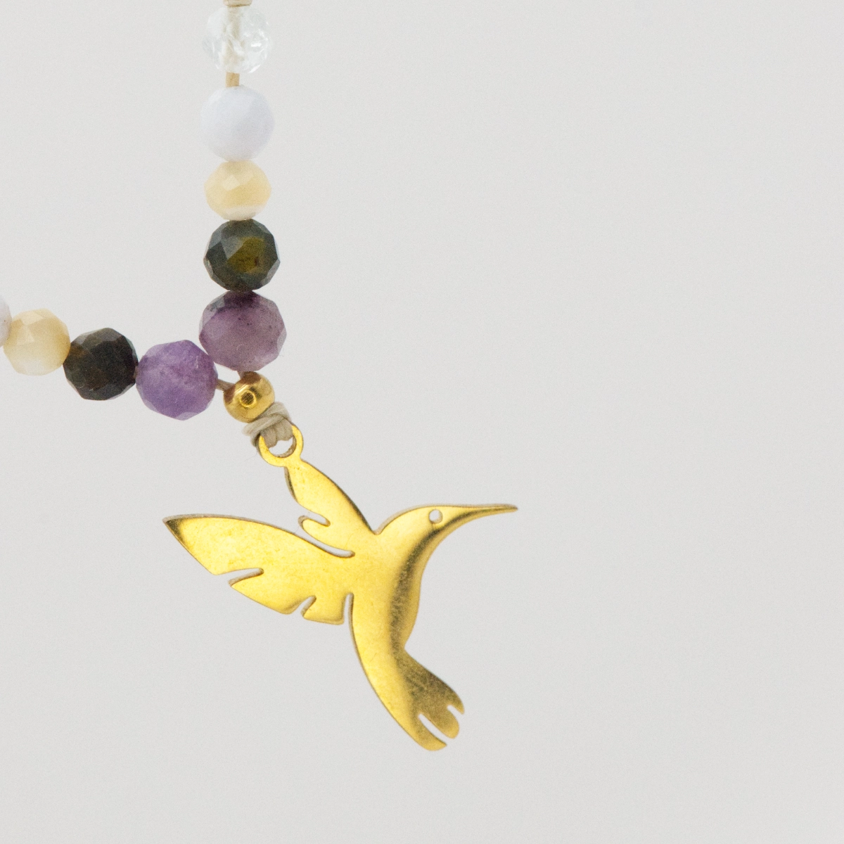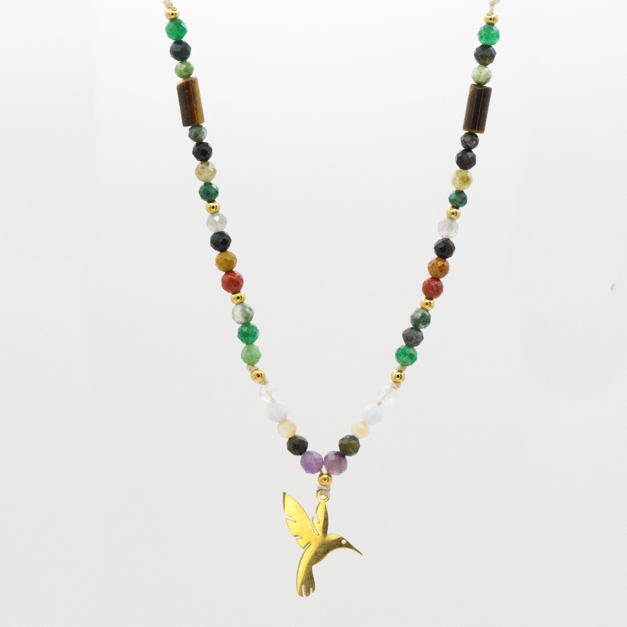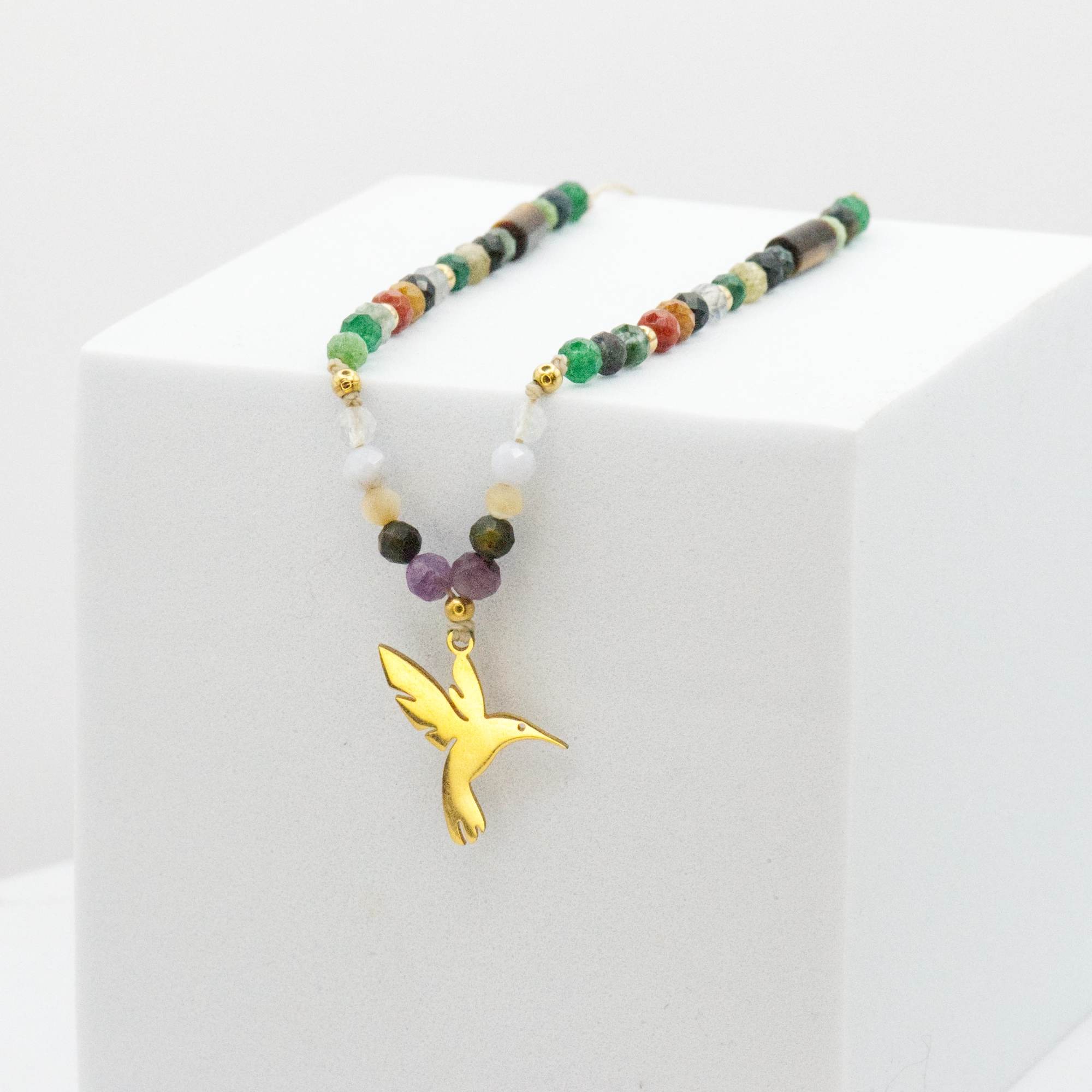Naszyjnik z naturalnymi kamieniami inspirowany obrazem Fridy Kahlo to prawdziwe dzieło sztuki. Każdy kamień odzwierciedla barwy z „Autoportretu z Kolibrem”, tworząc harmonijną i pełną życia kompozycję. Dodatkowym elementem, który wyróżnia ten naszyjnik, jest zawieszka w kształcie kolibra, wykonana ze stali szlachetnej. Koliber, który na obrazie Fridy symbolizuje wolność, radość i duchową odnowę, staje się centralnym punktem naszyjnika, podkreślając jego głęboką symbolikę. Naszyjnik ten jest nie tylko wyrazem uznania dla twórczości Fridy Kahlo, ale także manifestacją siły, odwagi i niegasnącej pasji.