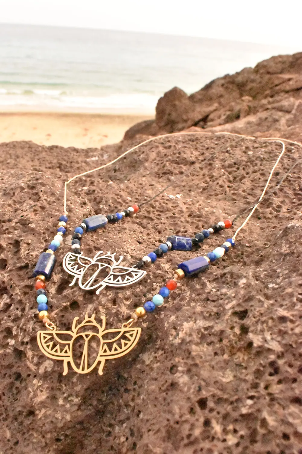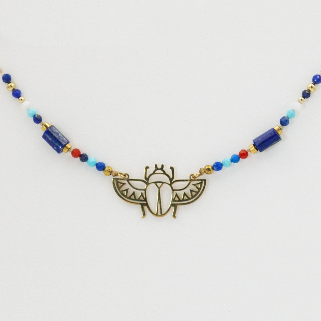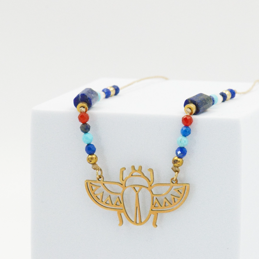 Naszyjnik łączy w sobie elegancję naturalnych kamieni z historycznym znaczeniem symbolu skarabeusza.