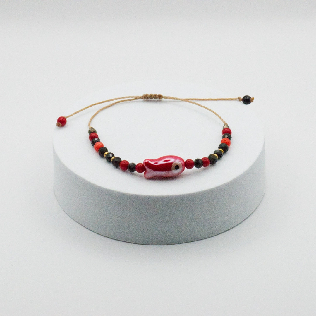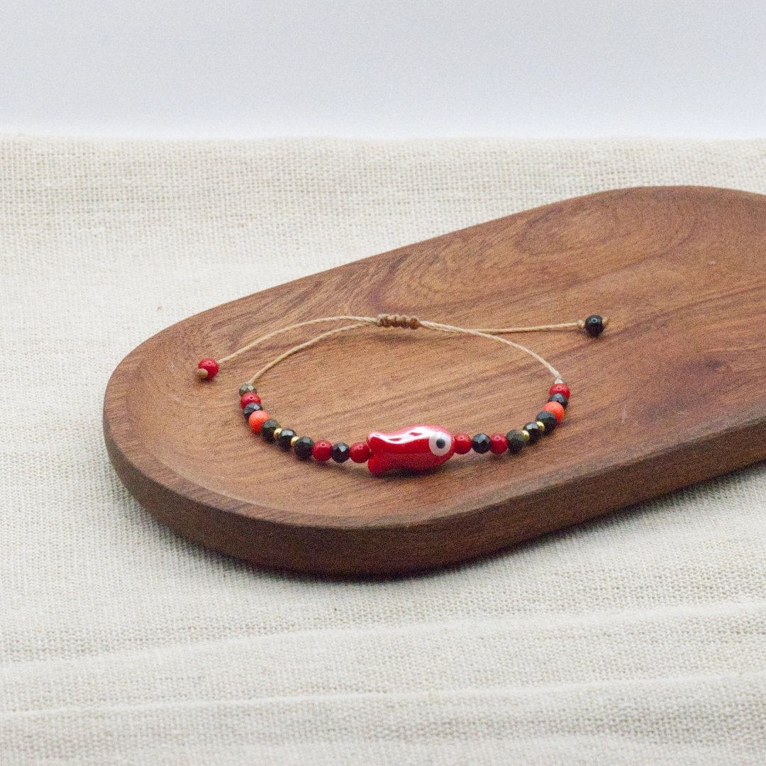 Bransoletka o nazwie Kyoto w kolorach miasta z czerwoną ceramiczną rybką oraz kamieniami naturalnymi, to wyjątkowy i elegancki dodatek który łączy w sobie estetykę japońskiej tradycji z naturalnym pięknem minerałów.