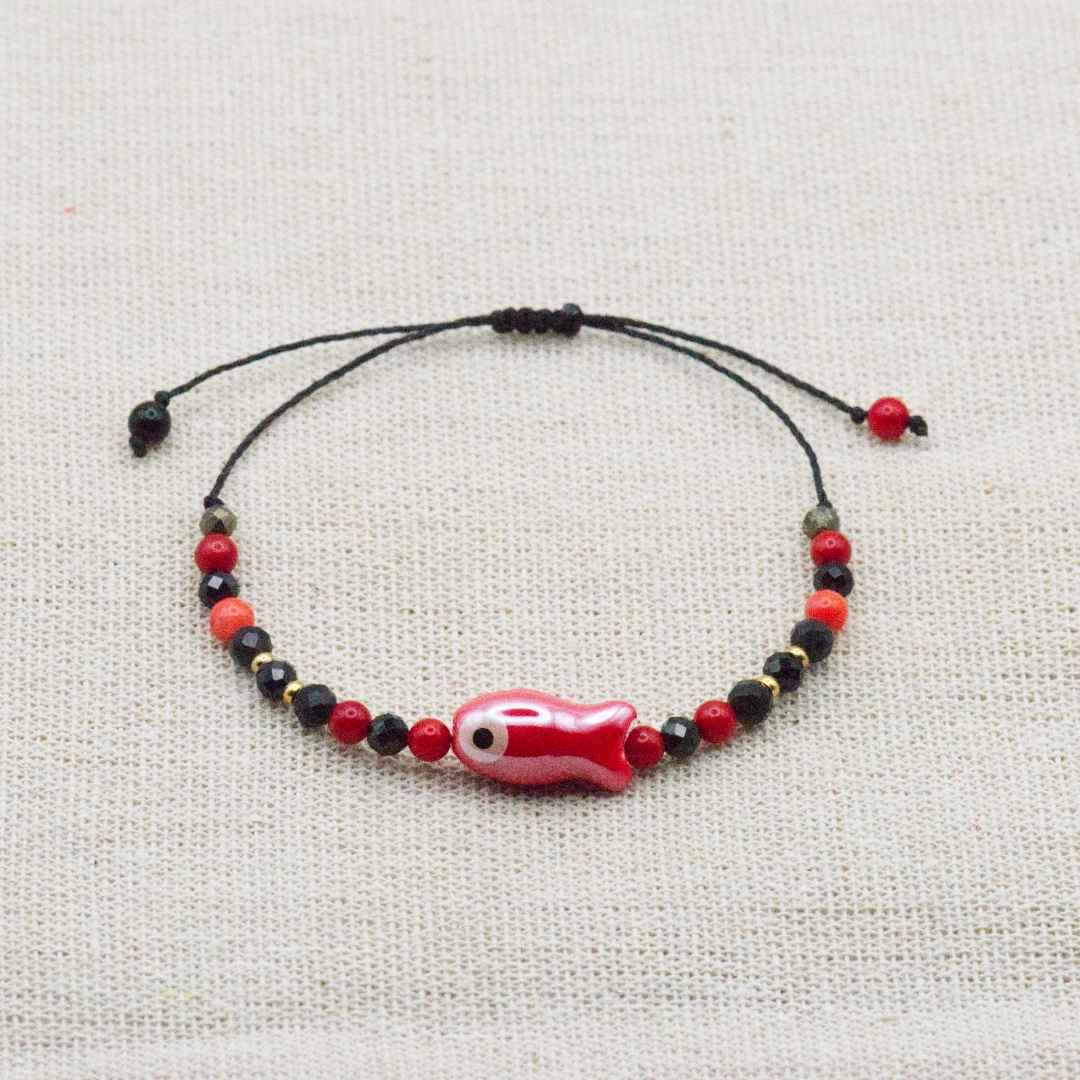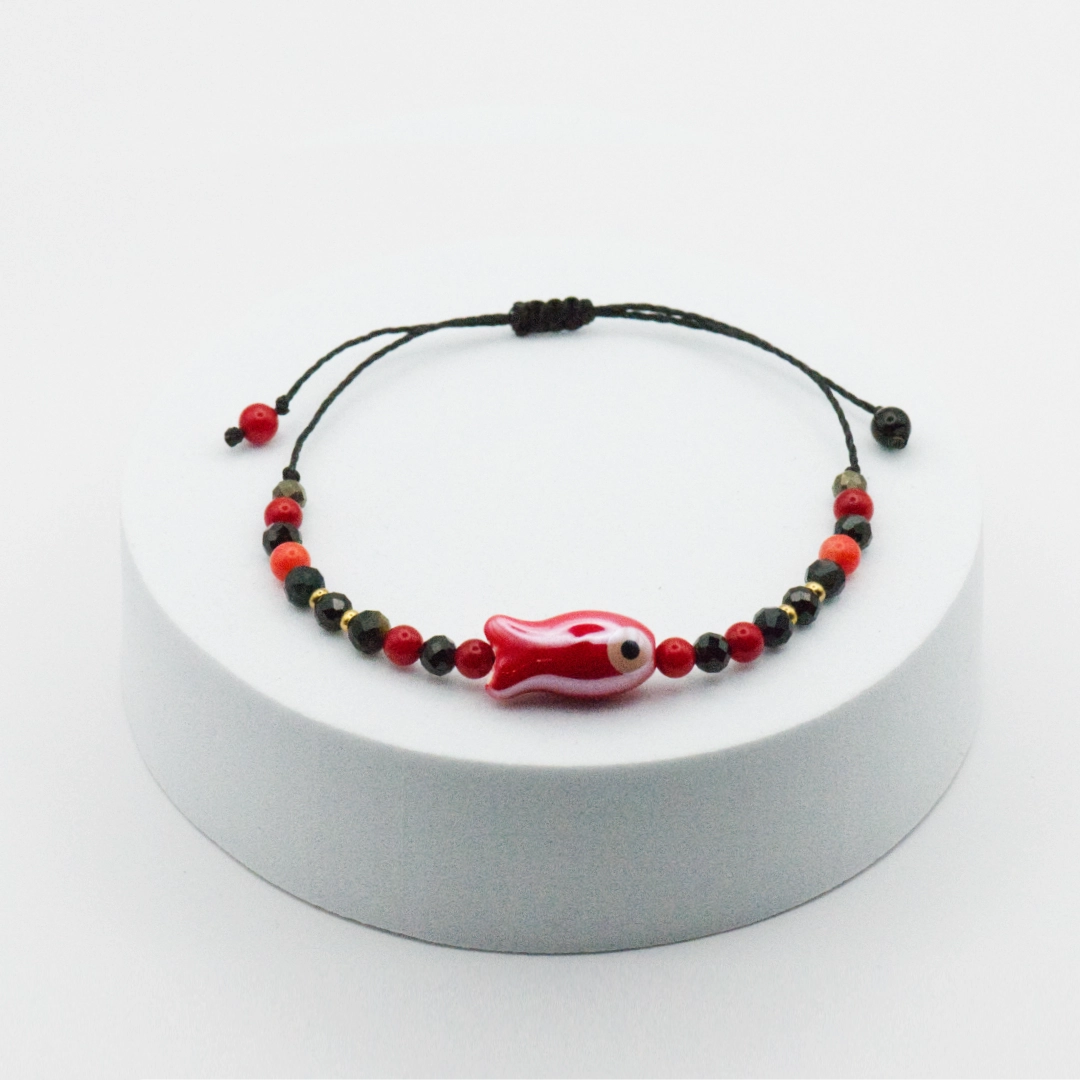 • Rybka: Centralnym elementem bransoletki jest mała, czerwona ceramiczna rybka. Symbolizuje szczęście, dobrobyt oraz pomyślność. Jest również kojarzona z harmonią, cierpliwością i wytrwałością.
