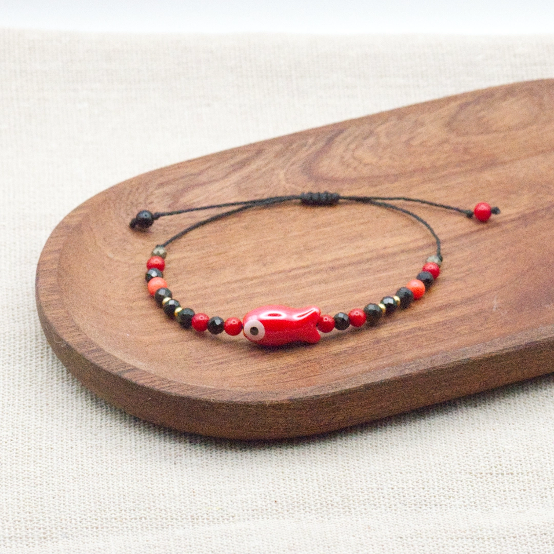 Bransoletka o nazwie Kyoto w kolorach miasta z czerwoną ceramiczną rybką oraz kamieniami naturalnymi to wyjątkowy i elegancki dodatek, który łączy w sobie estetykę japońskiej tradycji z naturalnym pięknem minerałów.