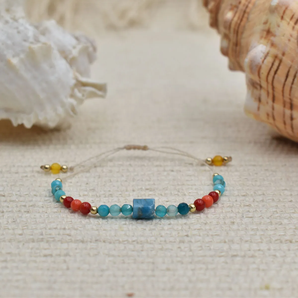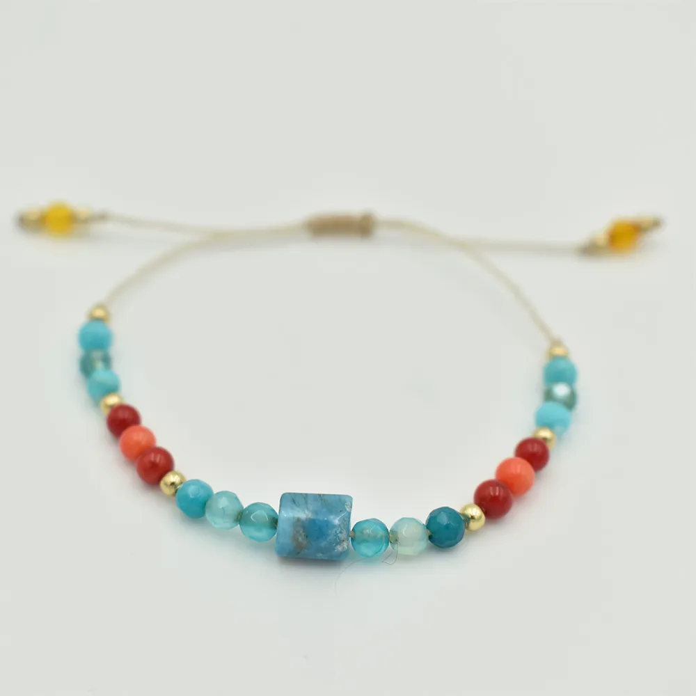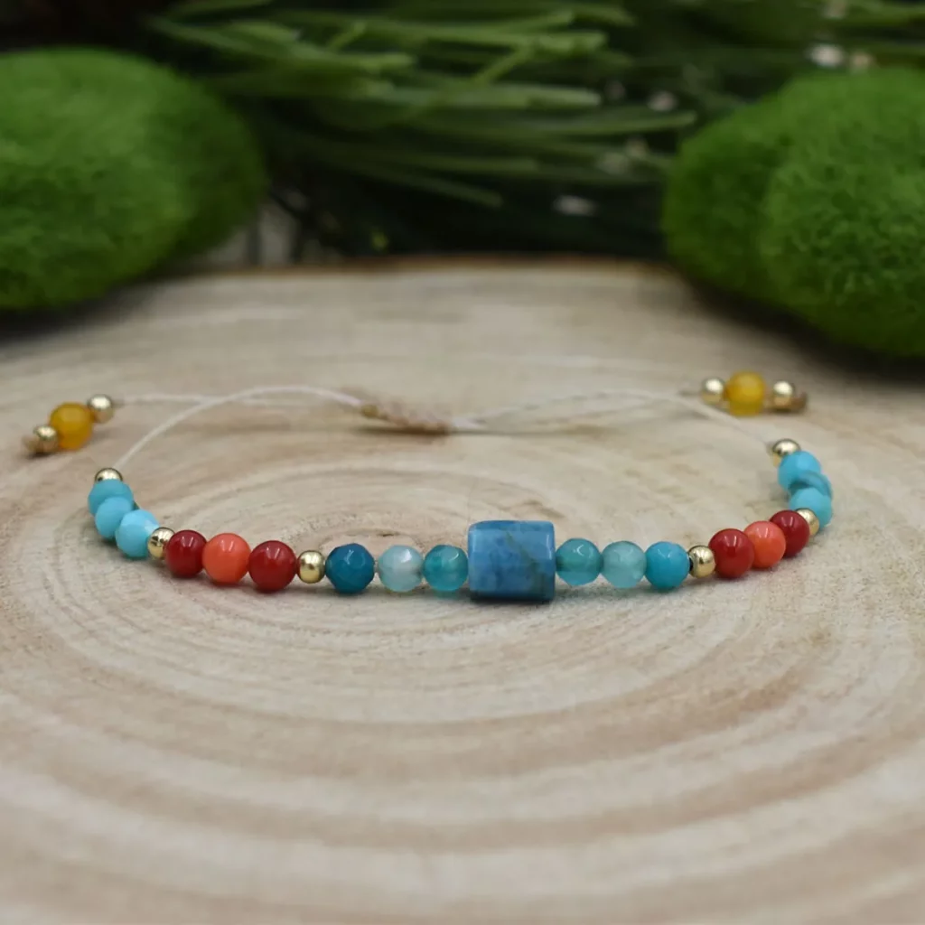 Bransoletka ”Coral Reef” to kolory błękitnej wody oraz pomarańcze pięknych raf koralowych. Użyłam kamieni takich jak : Apatyt, Agat Błękitny, Koral oraz Niebieska Masa Perłowa.