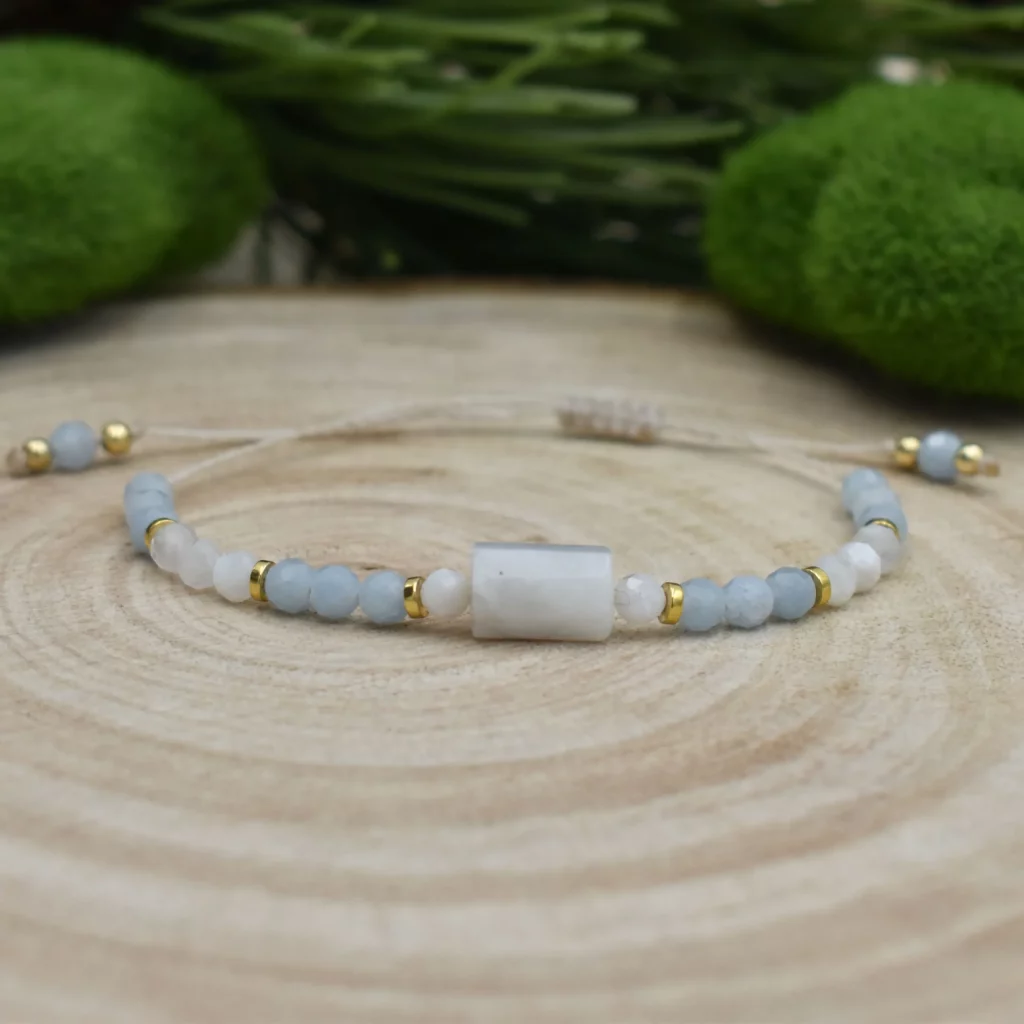Lodowa Bransoletka do której wykorzystane zostały kamienie takie jak : Akwamaryn, Hematyt, Topaz i Kamień Księżycowy.