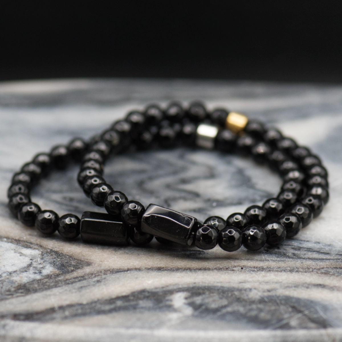 • Materiały: Bransoletka wykonana jest z fasetowanych kamieni onyksu, co nadaje jej subtelny, lecz wyrazisty blask. Starannie szlifowane powierzchnie kamieni sprawiają, że elegancko odbijają światło, nadając bransoletce głębi i luksusowego charakteru.