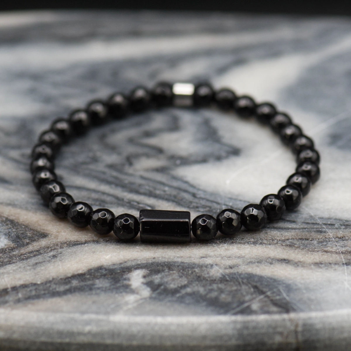 • Materiały: Bransoletka wykonana jest z fasetowanych kamieni onyksu, co nadaje jej subtelny, lecz wyrazisty blask. Starannie szlifowane powierzchnie kamieni sprawiają, że elegancko odbijają światło, nadając bransoletce głębi i luksusowego charakteru.