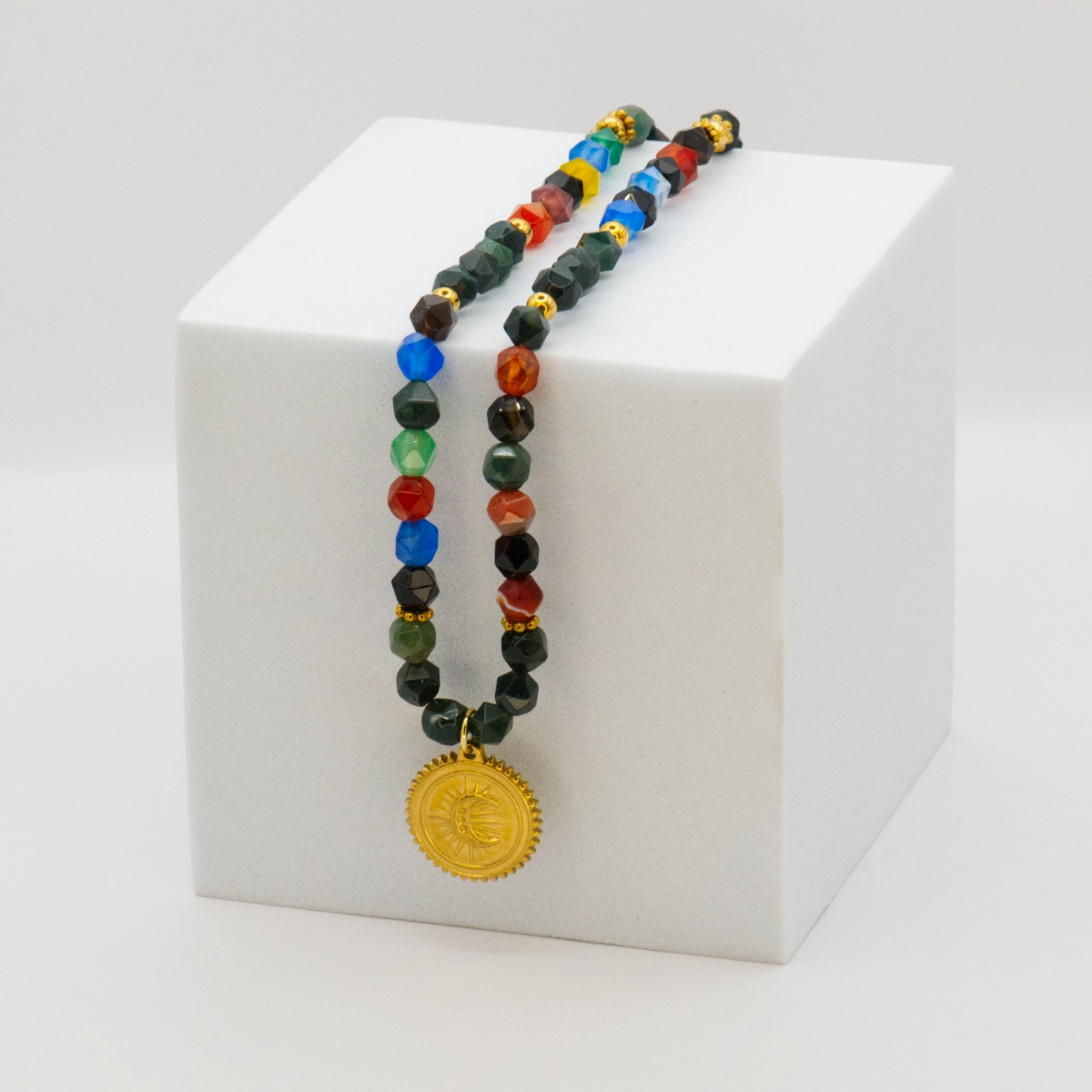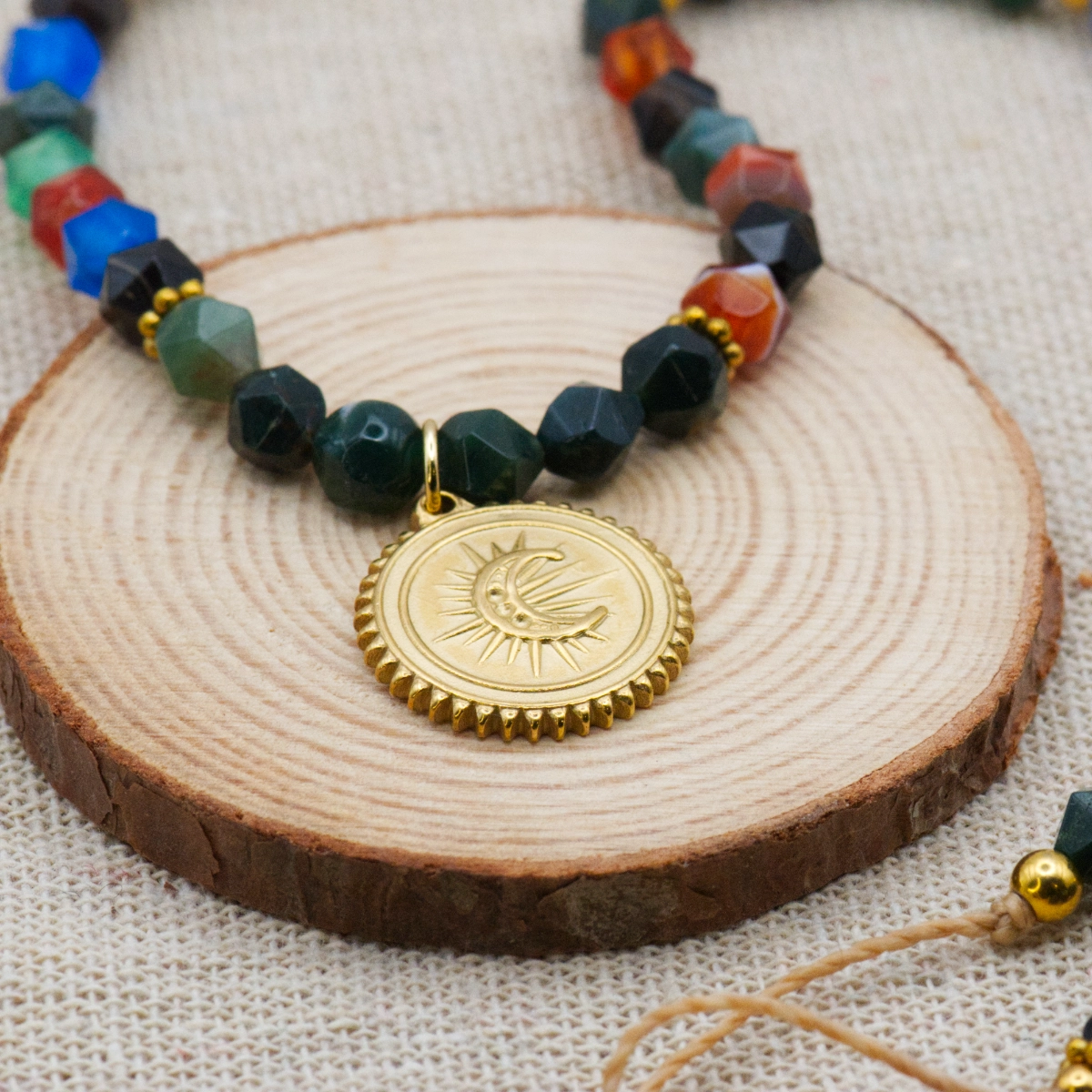 Naszyjnik Crystal #1 to wyjątkowa kompozycja naturalnych agatów, w tym mistycznych agatów mszystych, które nadają biżuterii niezwykłego charakteru. Sznurek umożliwia dopasowanie długości naszyjnika do Twoich preferencji, a zawieszka ze stali w kształcie księżyca dodaje mu nuty tajemniczości.