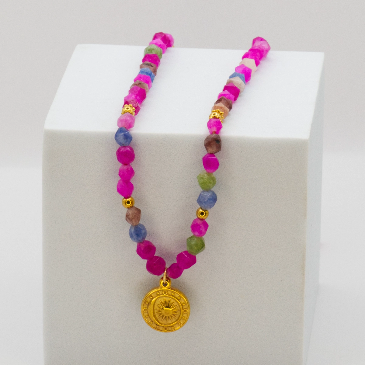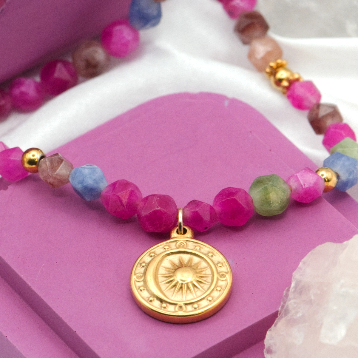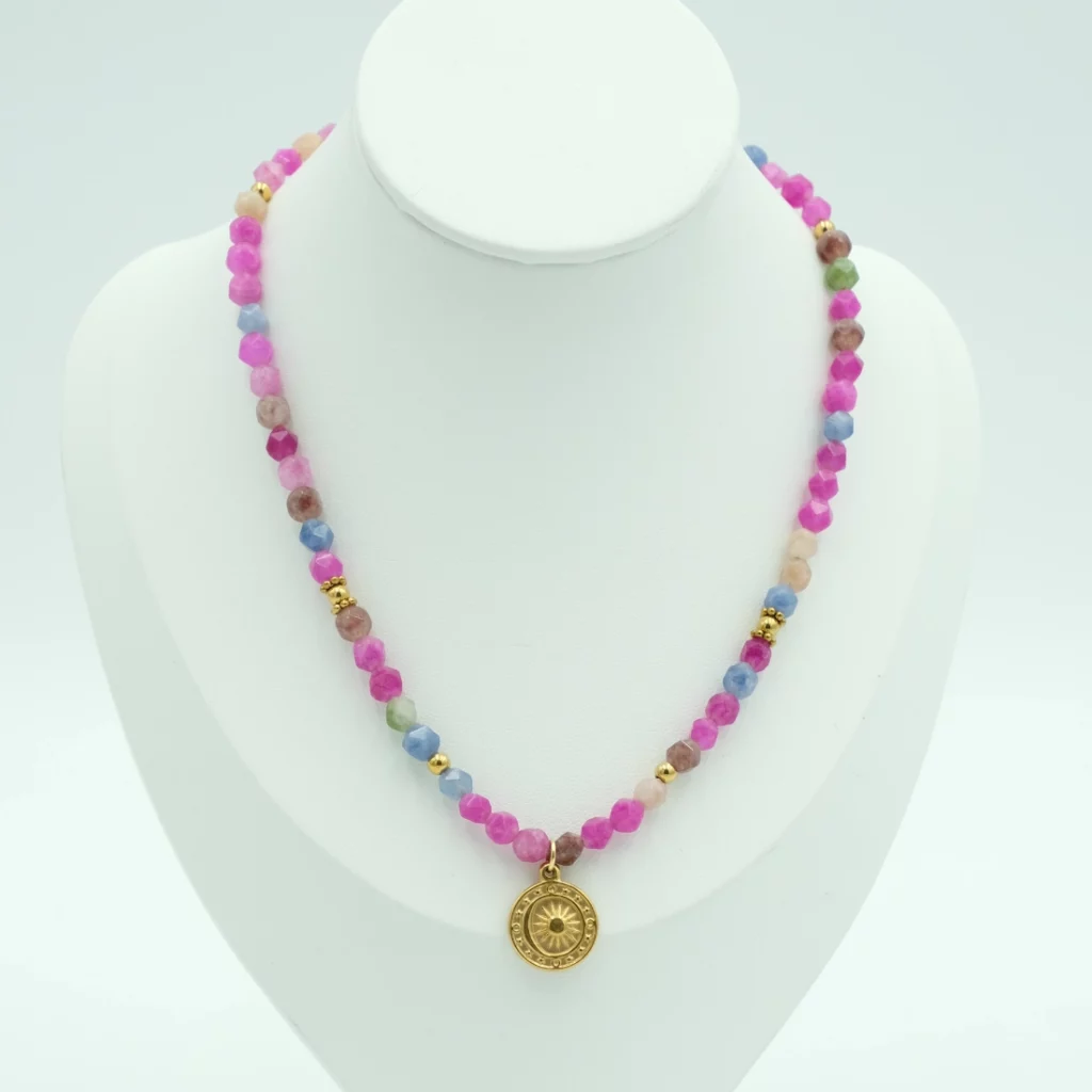 Naszyjnik Crystal #2 to wyjątkowa biżuteria wykonana z naturalnych turmalinów, z przewagą turmalinu różowego, który nadaje delikatności i subtelności. Regulowany sznurek poliestrowy, zapewnia wygodę noszenia i możliwość dostosowania długości naszyjnika do Twoich potrzeb. Dodatkowym elementem ozdobnym jest zawieszka ze stali nierdzewnej ze słońcem, która dodaje naszyjnikowi tajemniczego, kosmicznego charakteru.